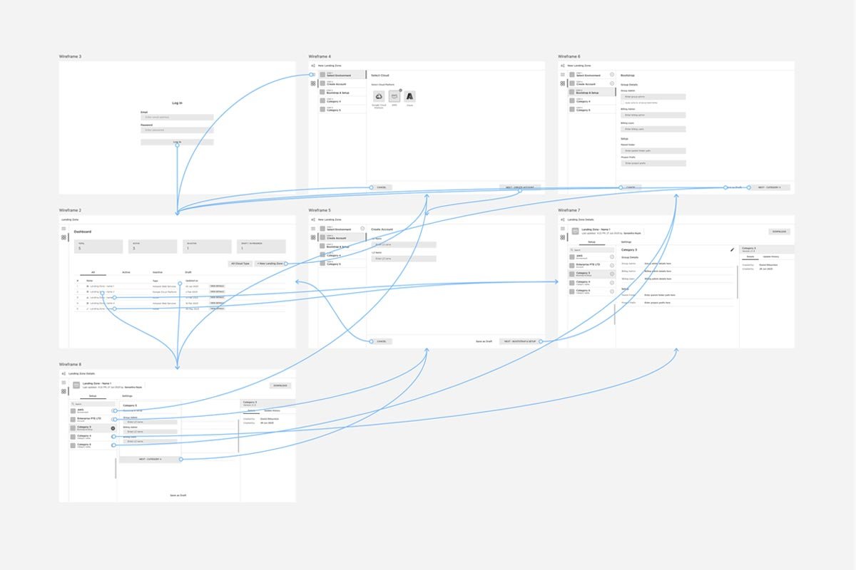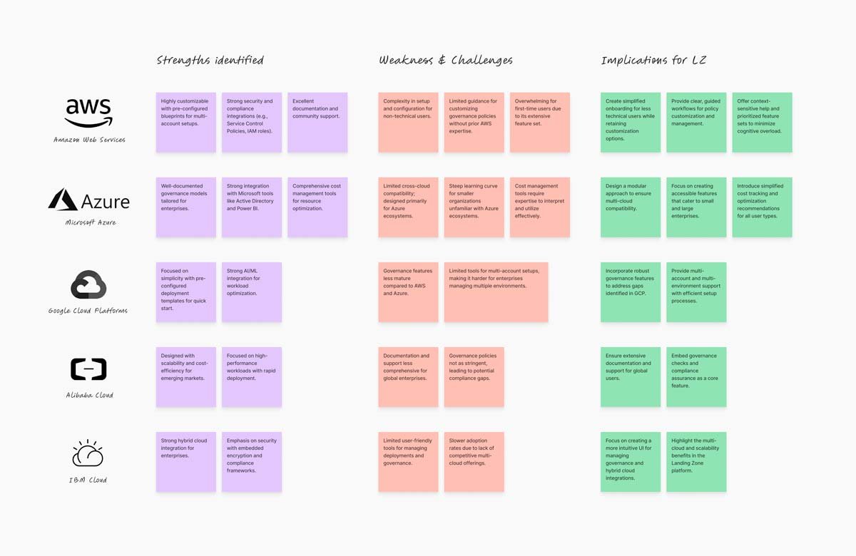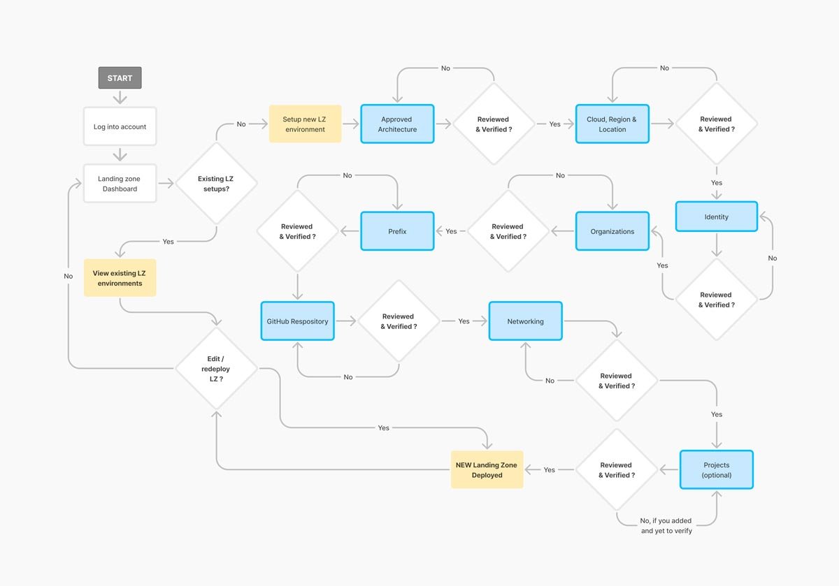 We carried out an in-depth analysis of leading Landing Zone platforms in the market. This research provided a clear benchmark for essential features like workload automation, governance tools, and multi-environment scalability. By identifying gaps in existing solutions, such as overly complex user interfaces and limited automation, we uncovered opportunities for differentiation. These insights guided the platform’s design direction, ensuring it was user-friendly, efficient, and equipped with features that directly addressed unmet needs in the market.
